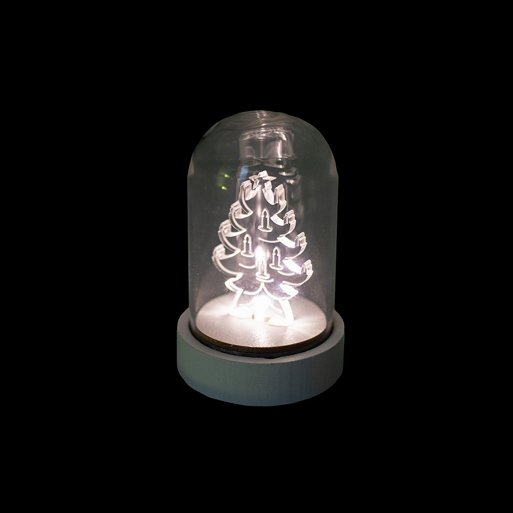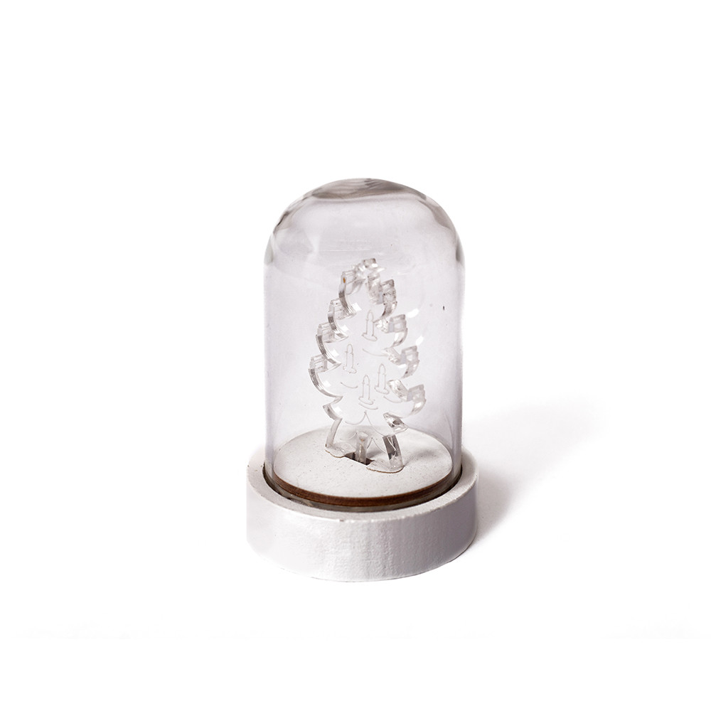 Dekortrend Fenyőfa üveg asztaldísz, 9 cm, meleg fehér, elemes
