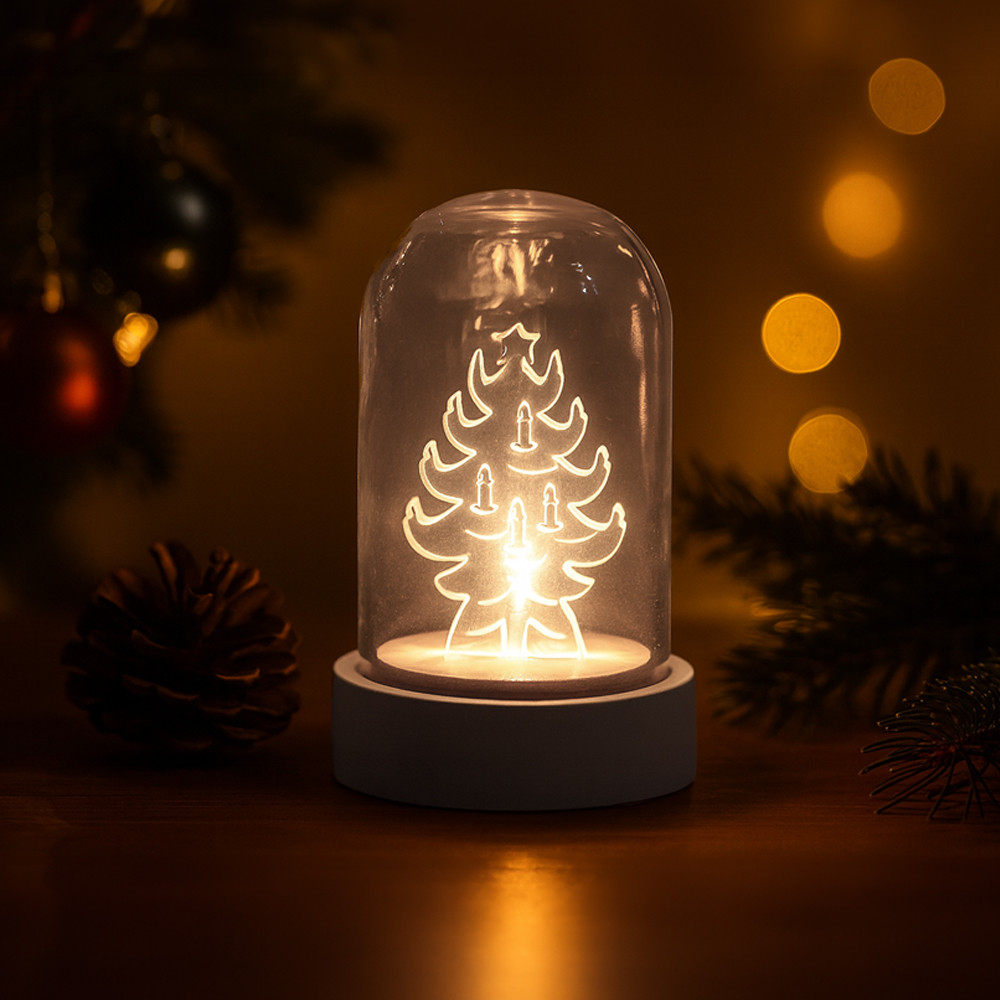 Varázsolj ünnepi hangulatot otthonodba ezzel a különleges, fenyőfa formájú üveg asztaldísszel! A 9 cm-es dekoráció belsejében melegfehér LED fény ragyog, amely meghitt, otthonos atmoszférát teremt a sötét téli estéken. Kompakt méretének köszönhetően könnyedén elhelyezhető az asztalon, komódon vagy akár az ablakpárkányon, így bármely helyiség stílusos ünnepi kiegészítője lehet.